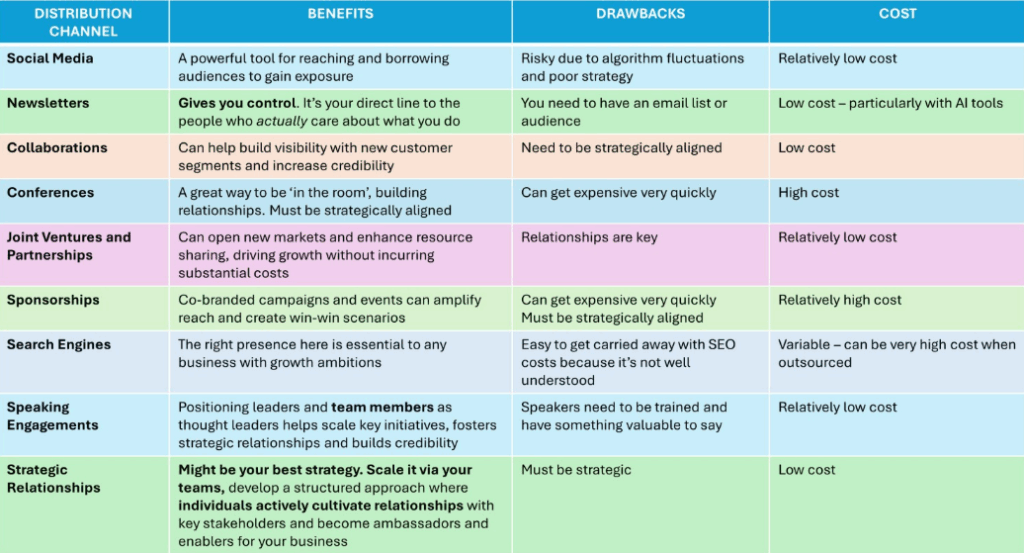 Let’s look at some distribution channels you can use to accelerate your growth. I’ve done the analysis for you – in the table above and in more detail below:
